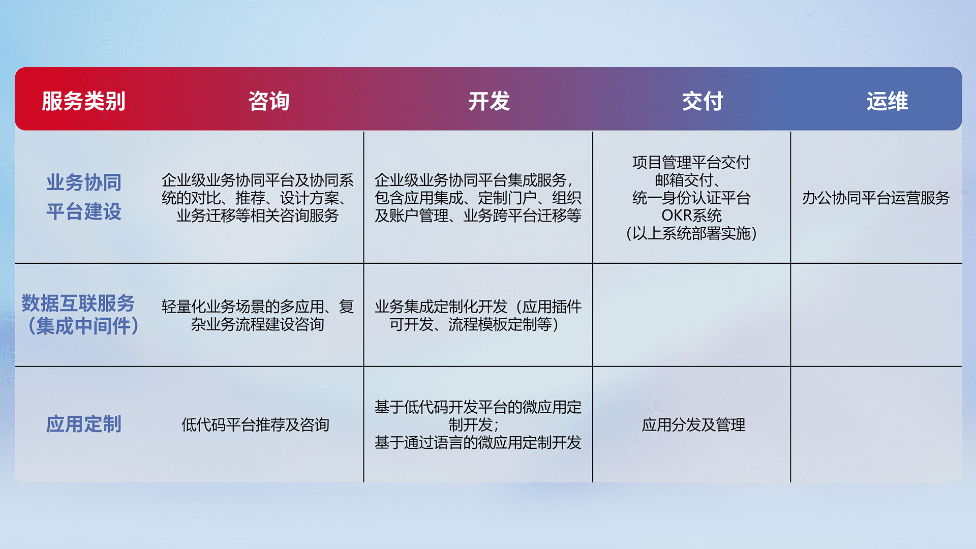 针对钉钉、、企微、、、IDaas等平台级产品提供产品的规划、、、、方案、、、交付、、定制化开发等服务,,实现如统一协同办公、、、、智能客户服务、、、混合会议管理、、、、智能数据查询、、等业务场景,,,,实现数字化转型。。。